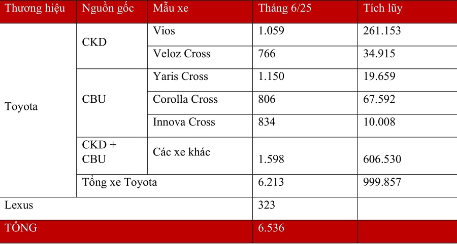 Cụ thể, doanh số toàn quốc của các mẫu xe Toyota đạt 6.213 xe, bao gồm 2.163 xe lắp ráp trong nước và 4.050 xe nhập khẩu nguyên chiếc. Tính đến hết 6 tháng đầu năm 2025, Toyota đã bàn giao tổng cộng hơn 29.000 xe đến tay khách hàng, ghi nhận mức tăng trưởng ấn tượng 31% so với cùng kỳ năm 2024. Tổng số xe Toyota tích lũy đến nay đạt 999.857 xe, dự kiến Toyota sẽ đạt cột mốc doanh số 1 triệu xe trong tháng 7 năm 2025, một cột mốc quan trọng hướng tới kỷ niệm 30 năm Toyota có mặt tại Việt Nam. Cột mốc ý nghĩa này đánh dấu sự phát triển bền vững của TMV tại Việt Nam và một lần nữa khẳng định niềm tin cũng như sự gắn bó mạnh mẽ của khách hàng dành cho Toyota suốt 30 năm qua.