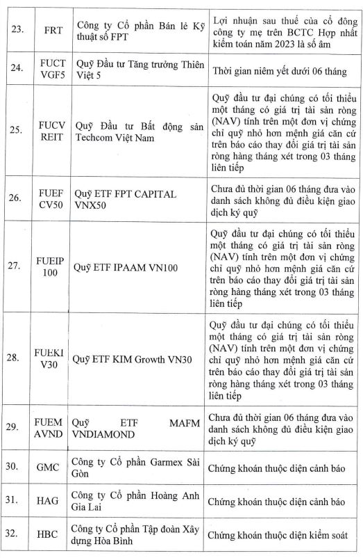 6 mã cổ phiếu (CRE, HU1, KPF, PSH, PTB, SRF) bị cắt margin do báo cáo tài chính hợp nhất năm 2023 có ý kiến không phải là ý kiến chấp nhận toàn phần của tổ chức kiểm toán.