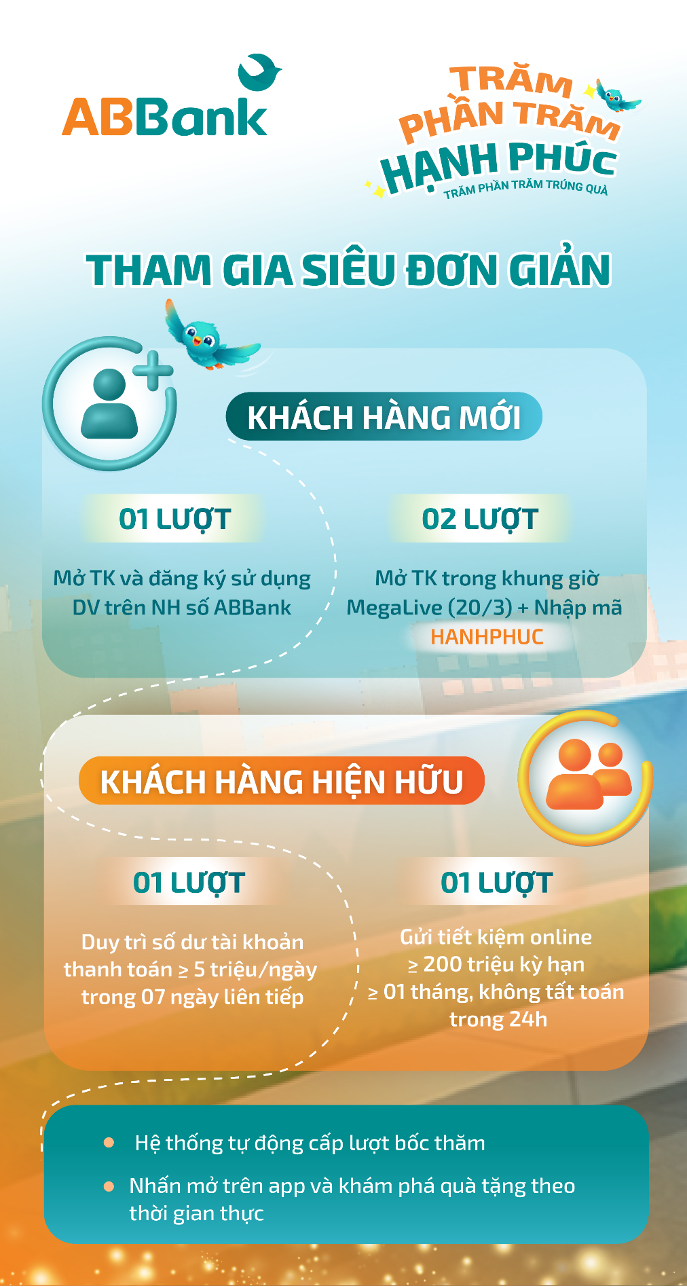 Để trở thành chủ nhân của Giải thưởng đặc biệt 01 lượng vàng 24K Chim Hạnh phúc, hoặc sở hữu 1 trong 1.500 phân vàng 24K Tiểu Kim Cát và hơn 5.000 giải hoàn tiền, khách hàng chỉ cần nhấn mở hộp quà trên ứng dụng ABBank. 100% lượt quay đều mang đến 1 quà tặng bất ngờ, cơ chế nhận quà chưa bao giờ giản đơn đến thế, khiến người tham gia tận hưởng trọn vẹn niềm vui trong từng cú chạm.