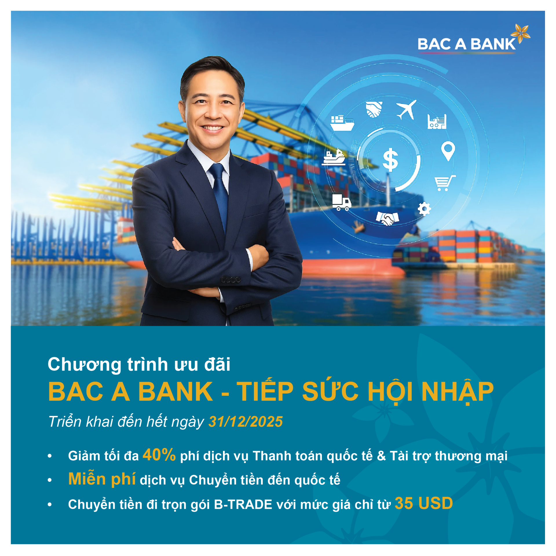 Chương trình áp dụng từ nay đến hết ngày 31/12/2025 dành cho Khách hàng doanh nghiệp hoạt động trong lĩnh vực xuất nhập khẩu có phát sinh các nghiệp vụ liên quan đến thanh toán quốc tế hoặc tài trợ thương mại tại BAC A BANK.