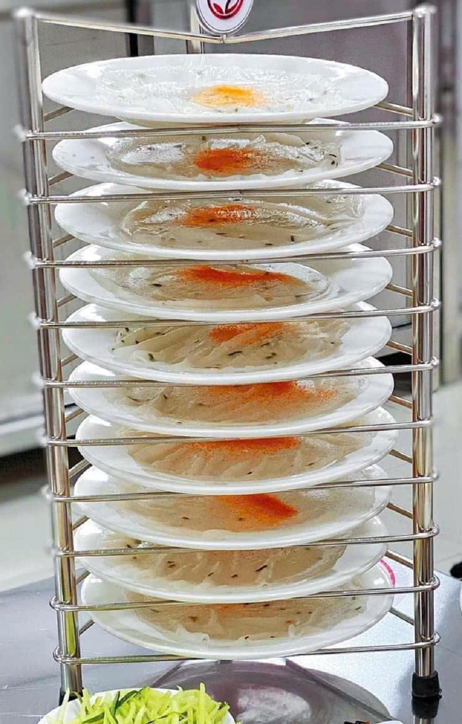 Điểm đặc biệt của món ăn nằm ở cách trình bày: Bánh được đặt trên từng đĩa riêng, không cuộn sẵn như bánh ướt thông thường, mà để thực khách tự chọn topping và cuốn bánh theo ý thích. Mỗi chồng bánh thường gồm 10 đĩa, được tráng nóng tại chỗ và mang lên bàn liên tục để giữ độ ấm và mềm.
