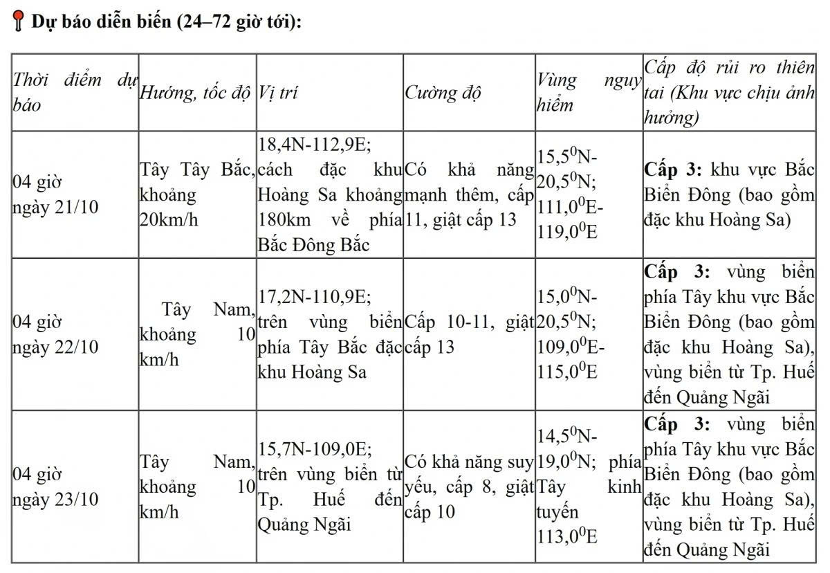 Hồi 4 giờ ngày 20/10, vị trí tâm bão ở vào khoảng 17,5 độ Vĩ Bắc; 117,2 độ Kinh Đông, cách đặc khu Hoàng Sa khoảng 540km về phía Đông Đông Bắc. Sức gió mạnh nhất vùng gần tâm bão mạnh cấp 9 (75-88km/giờ), giật cấp 11. Di chuyển theo hướng Tây Bắc với tốc độ khoảng 25km/h.