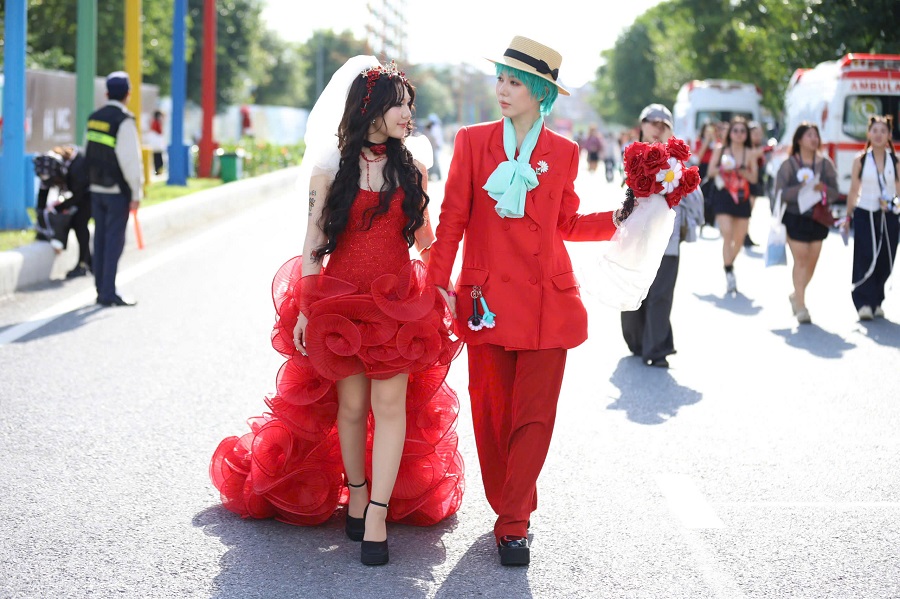 Từ váy cưới cô dâu, bộ vest hoa hồng và tất nhiên không thể thiêu khăn bandana... cả khu vực sự kiện như một sân khấu thời trang rực rỡ của các FAM.