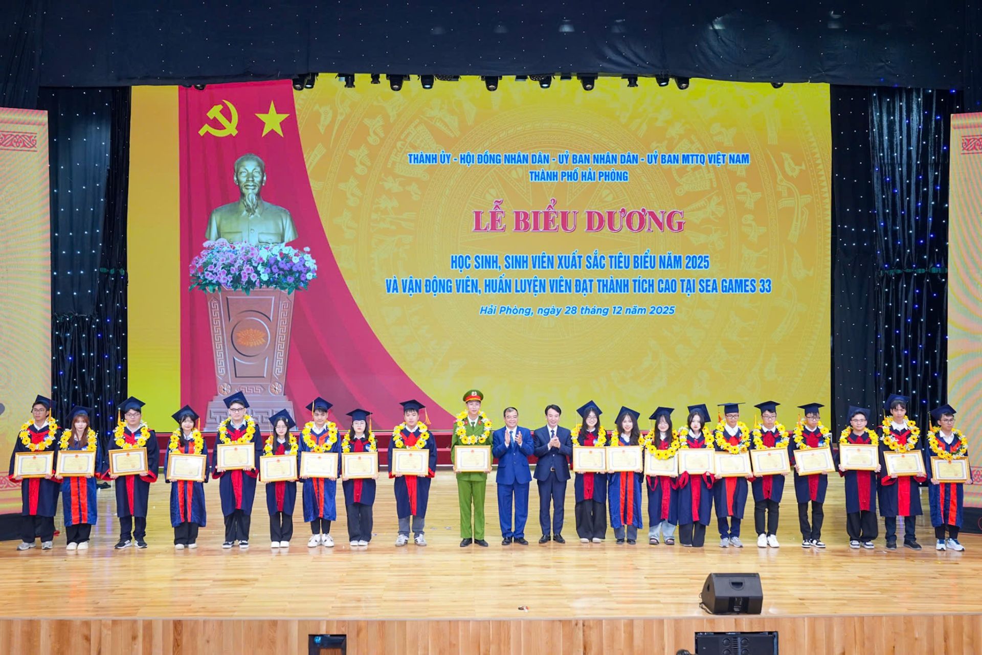 Năm nay là lần thứ 21 thành phố tổ chức Lễ biểu dương học sinh, sinh viên tiêu biểu. Tại buổi Lễ, thành phố biểu dương 225 học sinh, sinh viên xuất sắc tiêu biểu; trong đó, có 152 học sinh đạt giải quốc tế và quốc gia các môn văn hóa, khoa học kỹ thuật, viết thư quốc tế UPU; 28 học sinh tham gia kỳ thi tốt nghiệp trung học phổ thông năm 2025 đạt điểm cao và đỗ vào trường đại học, học viện trong và ngoài nước; 47 sinh viên tốt nghiệp thủ khoa loại giỏi trở lên tại các trường đại học trên địa bàn thành phố và sinh viên là người Hải Phòng tốt nghiệp thủ khoa loại giỏi trở lên tại các trường đại học, học viện trong cả nước. Cùng với đó, thành phố biểu dương 25 vận động viên và 16 huấn luyện viên của Hải Phòng đạt thành tích cao tại SEA Games 33. Đây là những tấm gương sáng, những bông hoa tiêu biểu cho truyền thống hiếu học, tinh thần vượt khó và khát vọng vươn lên của con người Hải Phòng thời kỳ mới.