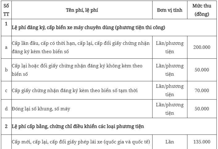 Biểu mức thu phí sát hạch lái xe; lệ phí cấp bằng, chứng chỉ điều khiển các loại phương tiện và lệ phí đăng ký, cấp biển xe máy chuyên dùng: