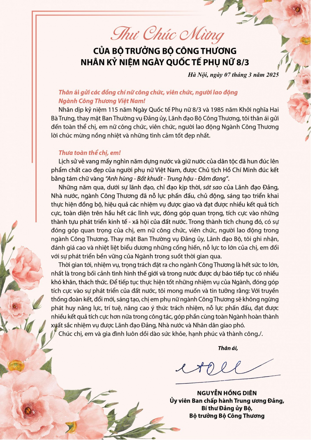 Nhân dịp kỷ niệm 115 năm Ngày Quốc tế Phụ nữ 8/3 và 1.985 năm Khởi nghĩa Hai Bà Trưng, thay mặt Ban Cán sự Đảng, lãnh đạo Bộ Công Thương, Bộ trưởng Nguyễn Hồng Diên đã gửi đến toàn thể chị, em nữ công chức, viên chức, người lao động ngành Công Thương lời chúc mừng nồng nhiệt và những tình cảm tốt đẹp nhất.
