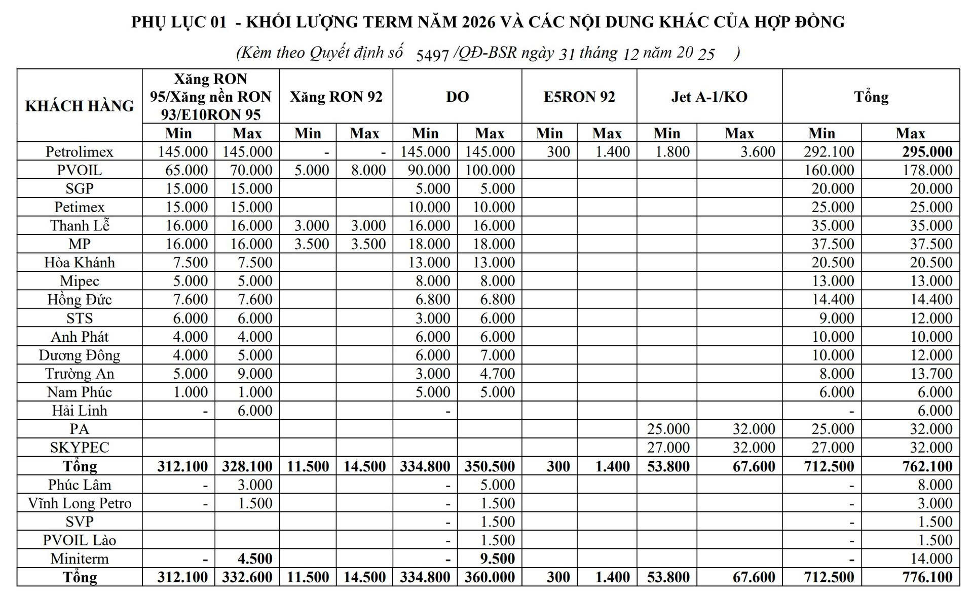Bên cạnh giá trị hợp đồng, BSR đã chốt kế hoạch cung ứng cho toàn bộ hệ thống đầu mối trong năm 2026 với tổng sản lượng xăng dầu dự kiến từ 712.500 đến 776.100m3 .