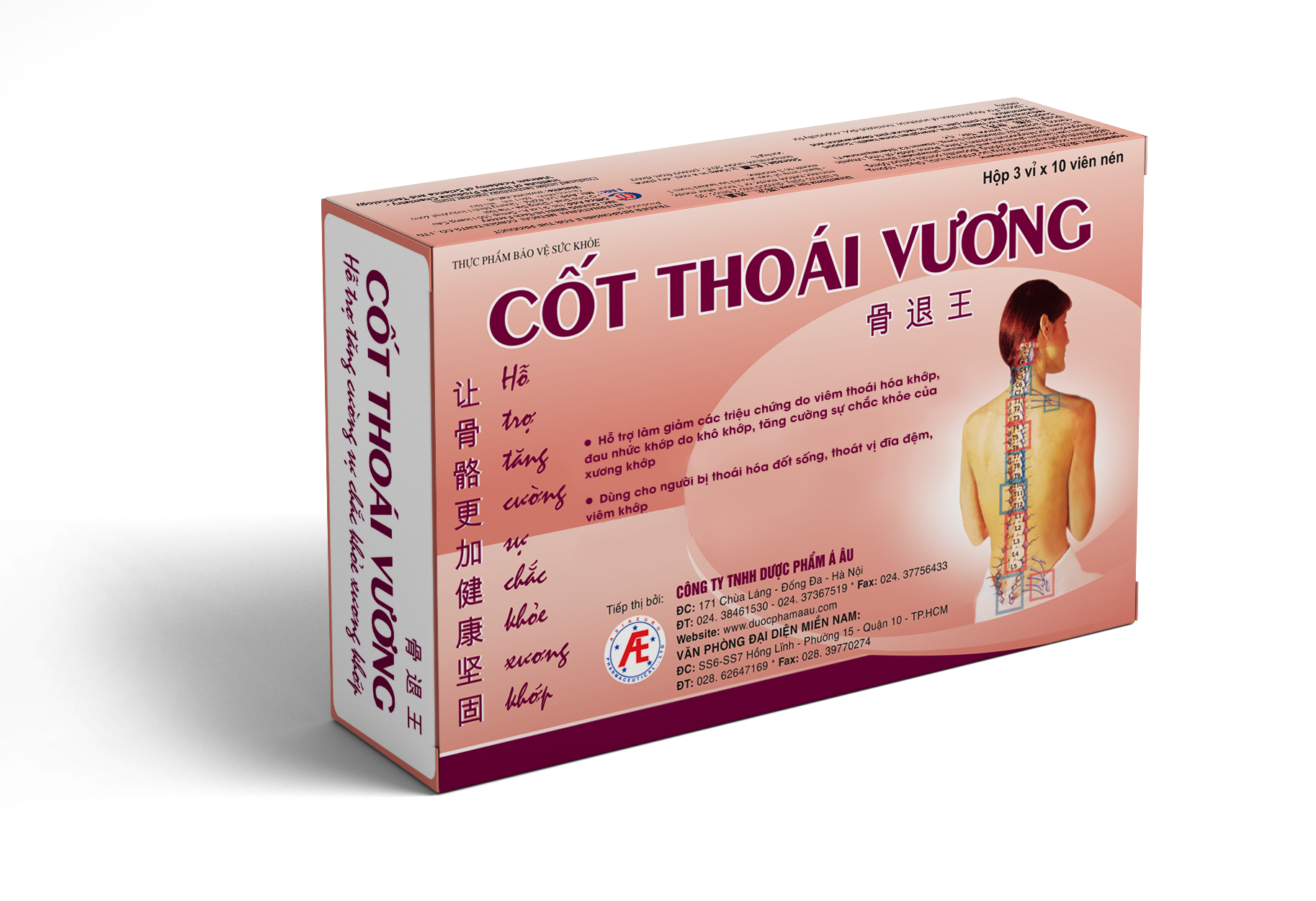 TPBVSK Cốt Thoái Vương - Hỗ trợ tăng cường sự chắc khỏe xương khớp *Thành phần: Dầu vẹm xanh, cao thiên niên kiện, chiết xuất nhũ hương, MSM (Methylsulfonylmethane), Canxi, Glycine, Vitamin B1, B2, Magie, Vitamin K2 *Công dụng: - Hỗ trợ làm giảm các triệu chứng do viêm thoái hóa khớp, đau nhức khớp do khô khớp. - Bổ sung các dưỡng chất cần thiết cho khớp. - Hỗ trợ tăng cường sự chắc khỏe của xương khớp * Đối tượng sử dụng: - Thích hợp với người bị thoái hóa đốt sống, thoát vị đĩa đệm, viêm khớp. *Hướng dẫn sử dụng: - Ngày uống 4 viên, chia làm 2 lần; 30 phút trước khi ăn hoặc sau ăn 1 giờ. - Mỗi đợt sử dụng nên kéo dài từ 3 đến 6 tháng. Tiếp thị và phân phối bởi: Công ty TNHH Dược Phẩm Á Âu Địa chỉ: Số 171 Phố Chùa Láng - Phường Láng Thượng - Quận Đống Đa - Hà Nội. ĐT: 024.38461530 - 028.62647169 GPQC: 02496/2019/ATTP-XNQC *Thực phẩm này không phải là thuốc, không có tác dụng thay thế thuốc chữa bệnh. *Sản phẩm có bán tại các hiệu thuốc trên toàn quốc. |
