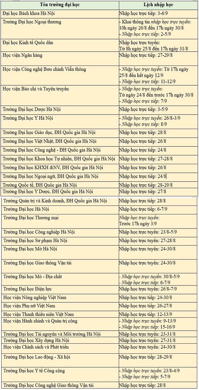 Dưới đây là lịch nhập học của tân sinh viên các trường đại học ở Hà Nội: