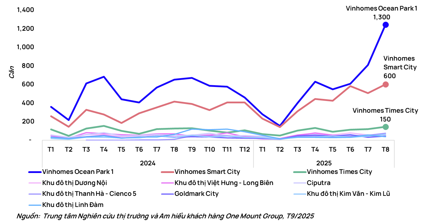 Vinhomes Ocean Park 1 nổi bật với lượng giao dịch kỷ lục, chiếm hơn 30% thị phần trong tháng 8/2025. So với các khu đô thị khác như Vinhomes Smart City (600 giao dịch) hay Vinhomes Times City (150 giao dịch), dự án này dẫn đầu thị trường liên tục từ tháng 1/2024 đến nay.