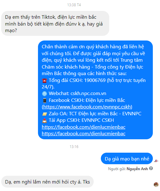 Nếu phát hiện bất kỳ trang website hoặc tài khoản mạng xã hội,... nghi ngờ mạo danh EVNNPC, Quý khách hàng vui lòng liên hệ ngay với Trung tâm Chăm sóc khách hàng EVNNPC qua Tổng đài 19006769 (phục vụ 24/7) để được tư vấn, giải đáp kịp thời.