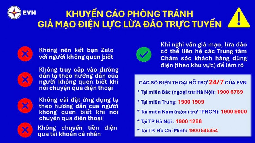 Để phòng tránh hiện tượng lừa đảo, Tập đoàn Điện lực Việt Nam (EVN) và các đơn vị điện lực thông tin và khuyến cáo khách hàng như sau: