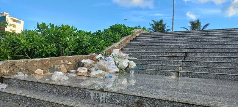 Thêm nữa, môi trường xung quanh có hiện tượng rác “bủa vây”. Trên bãi biển, còn lổn nhổn bao ni long, hộp xốp, ly nhựa, làm xấu xí hình ảnh bãi biển. Khu vực bậc thang dẫn từ tỉnh lộ ven biển đi xuống khu vực dịch vụ kinh doanh ăn uống, hải sản được kè đá hoa cương bóng loáng lại biến thành bãi rác, chất đầy ly nhựa, hộp xốp, bao ni long… Rác hải sản bốc mùi hôi thối, gây ô nhiễm môi trường xung quanh, ảnh hưởng đến không gian dạo bộ, tập thể dục buổi sáng của người dân, du khách.