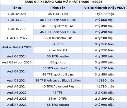 Trên đây là bảng giá xe ô tô hãng Audimới nhất tháng 11/2025 tại Việt Nam chưa bao gồm chi phí lăn bánh.