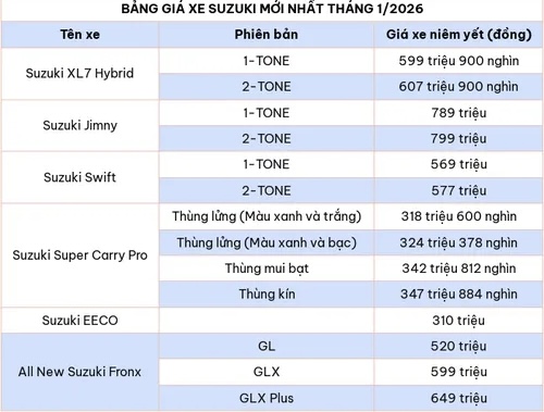 Trên đây là bảng giá xe ô tô hãng Suzuki mới nhất tháng 1/2026 tại Việt Nam chưa bao gồm chi phí lăn bánh:
