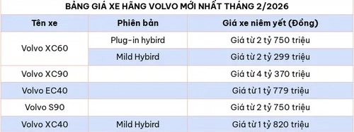 Trên đây là bảng giá xe ô tô của hãng Volvo mới nhất tháng 2/2026 tại Việt Nam chưa bao gồm chi phí lăn bánh.