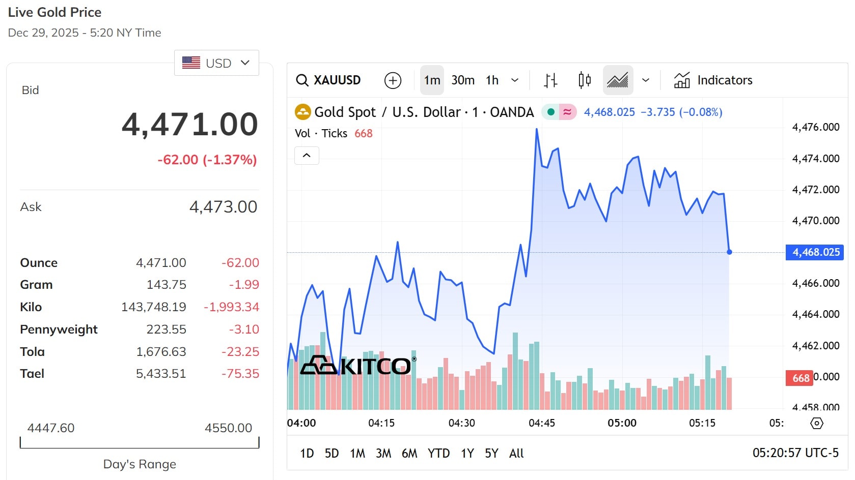 Tính đến 17h30 ngày 29/12 (giờ Việt Nam), giá vàng thế giới giao ngay mức 4.507,5 USD/ounce, giảm mất 5,1 USD/ounce so với ngày hôm qua.