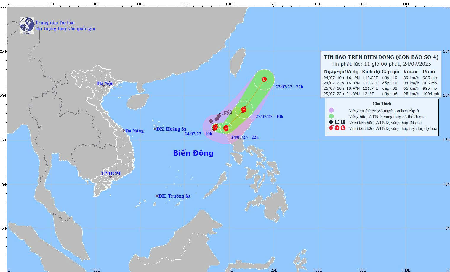 Theo Trung tâm Dự báo Khí tượng Thủy văn Quốc gia, vào lúc 10h sáng 24/7, vị trí tâm bão số 4 (Comay) ở 16,4°N; 118,5°E, trên vùng biển phía Đông của khu vực Bắc Biển Đông. Bão có cường độ cấp 9–10 (75–102km/h), giật cấp 12.