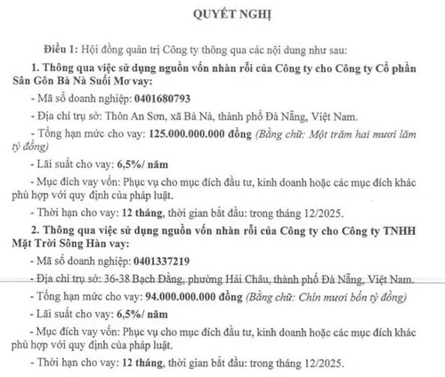 Theo nghị quyết, Cáp treo Núi Bà Tây Ninh chấp thuận cho Công ty CP Sân Gôn Bà Nà Suối Mơ (địa chỉ tại thôn An Sơn, xã Bà Nà, Đà Nẵng) vay với hạn mức tối đa 125 tỷ đồng. Khoản vay có lãi suất 6,5%/năm, phục vụ hoạt động đầu tư, kinh doanh hoặc các mục đích phù hợp với quy định pháp luật.