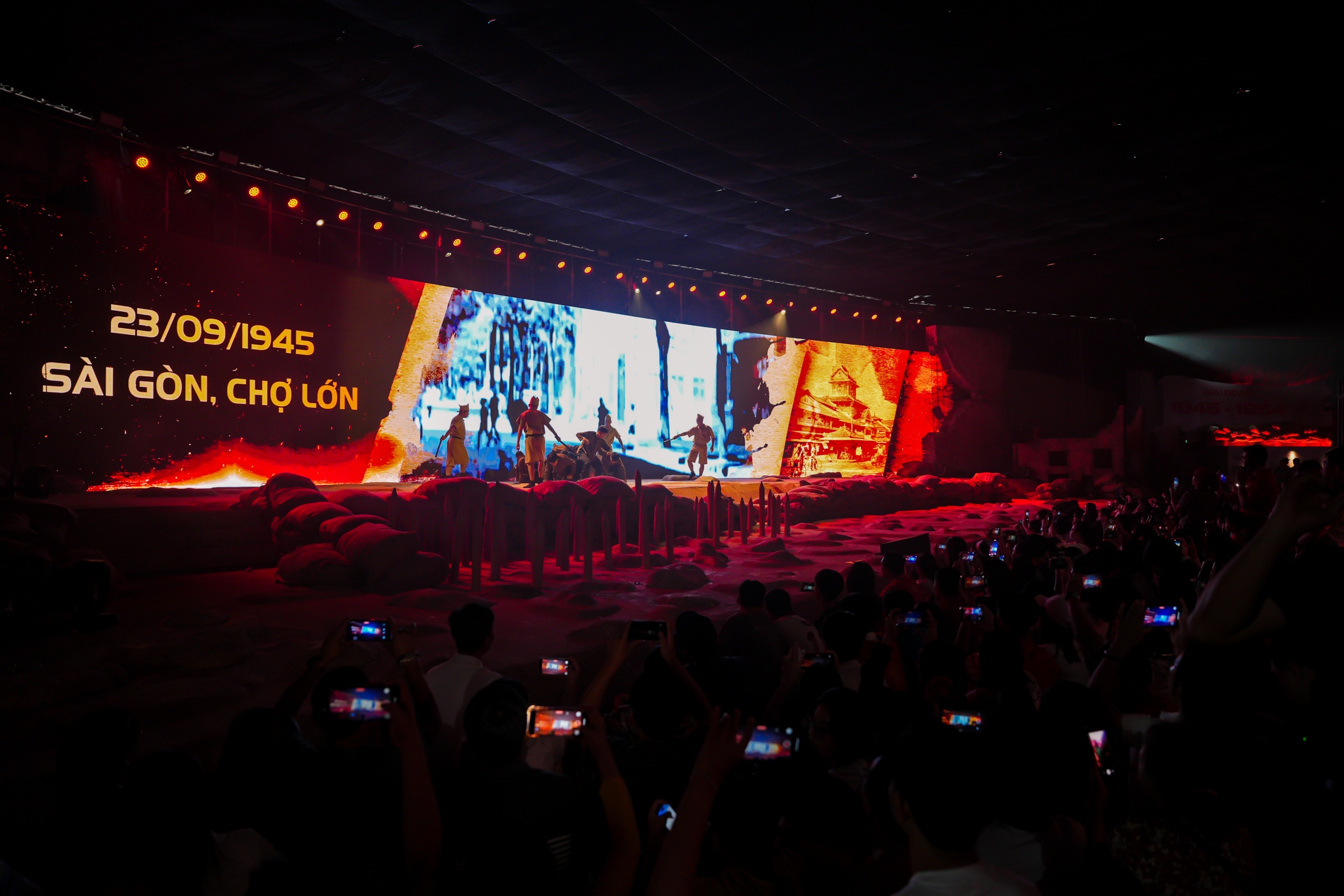 Sảnh trung tâm triển lãm chủ đề “95 năm Cờ Đảng soi đường” khiến du khách choáng ngợp với sân khấu bán thực cảnh rộng 1.500 m2, ứng dụng hiệu ứng 4D ánh sáng, khói lửa, âm thanh, tái hiện chiến trường từ Điện Biên Phủ đến ngày thống nhất.