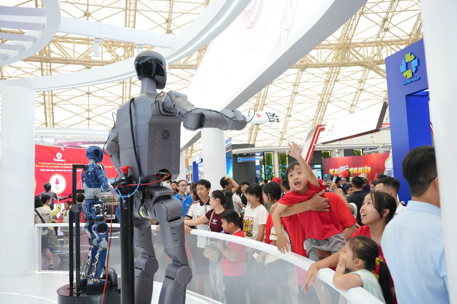 Chị Hà Phương (37 tuổi, Nam Từ Liêm, Hà Nội) cho biết con trai 12 tuổi của chị đặc biệt yêu thích robot nên nằng nặc đòi bố mẹ đưa đi triển lãm sau khi xem một số video giới thiệu trên TikTok. Cậu nhóc mê mẩn khi được trò chuyện với robot hình người của VinMotion tại khu trưng bày Vingroup ở sảnh 3. Với bé, đây là trải nghiệm không thể nào quên vì lần đầu thấy robot có thể làm theo các động tác chào cờ, vẫy tay… giống mình.
