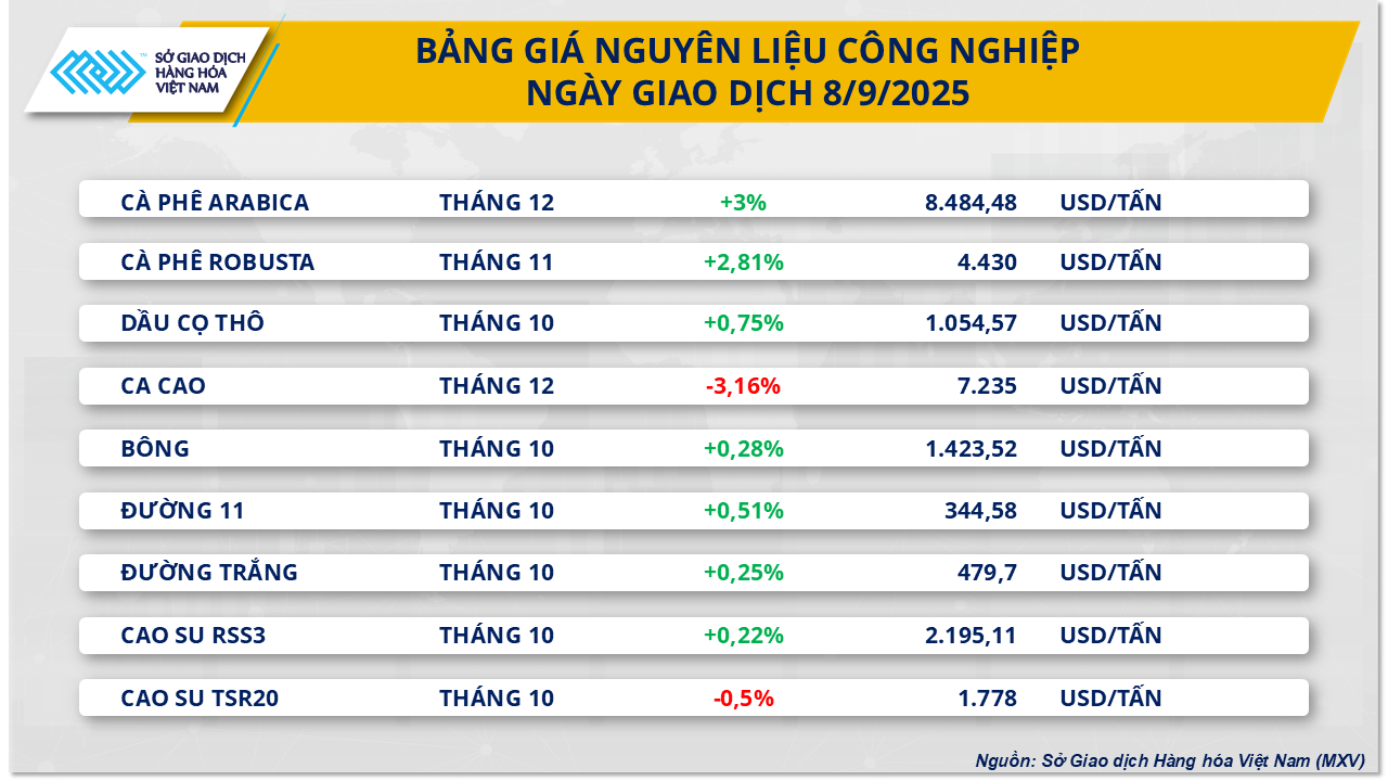 Khép lại phiên giao dịch ngày hôm qua, thị trường nguyên liệu công nghiệp chứng kiến lực mua mạnh mẽ với 7 trên 9 mặt hàng đồng loạt tăng giá. Trong đó, giá cà-phê Arabica hợp đồng tháng 12 tăng tới 3% lên mức 8.484 USD/tấn trong khi giá cà-phê Robusta cũng ghi nhận mức tăng hơn 2,8% lên mức 4.430 USD/tấn.