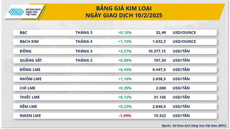 Phiên giao dịch đầu tuần, thị trường chứng kiến sắc xanh phủ kín hầu hết các mặt hàng kim loại sau những thông tin mới nhất về chính sách thuế quan của Mỹ và triển vọng tiêu thụ lạc quan.