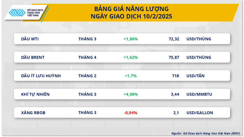 4/5 mặt hàng năng lượng đồng loạt tăng giá. Trong đó, giá dầu thế giới bật tăng trong phiên giao dịch ngày hôm qua (10/2) sau quyết định điều chỉnh giá của các nhà sản xuất Trung Đông. Theo ghi nhận, giá dầu tăng gần 2% lên mức 72,32 USD/thùng đối với dầu WTI và 75,87 USD/thùng đối với dầu Brent, chấm dứt chuỗi giảm giá kéo dài ba tuần liên tiếp. Động thái này cho thấy thị trường dầu mỏ đã phần nào bỏ qua những lo ngại về tác động từ tuyên bố áp thuế mới của Tổng thống Mỹ Donald Trump.