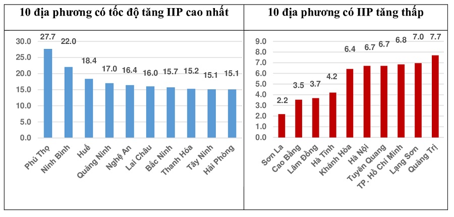 IIP 9 tháng năm 2025 so với cùng kỳ năm trước tăng ở cả 34 địa phương. Một số địa phương có chỉ số IIP đạt mức tăng khá cao do ngành công nghiệp chế biến, chế tạo; ngành sản xuất và phân phối điện tăng cao. Ở chiều ngược lại, một số địa phương có chỉ số IIP tăng thấp do ngành công nghiệp chế biến, chế tạo; ngành khai khoáng và ngành sản xuất, phân phối điện tăng thấp hoặc giảm.