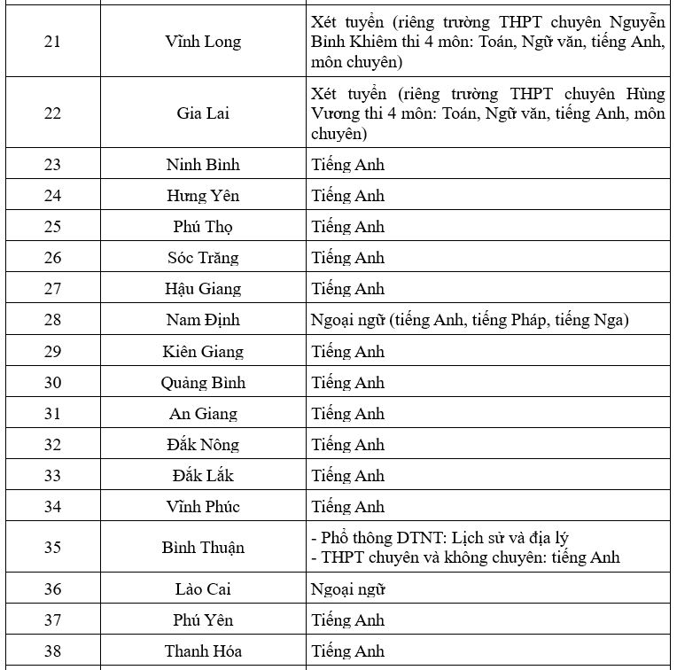Tại Bình Thuận, kỳ thi tuyển sinh vào lớp 10 trường Phổ thông Dân tộc Nội trú tỉnh có môn thi thứ ba là Lịch sử - Địa lý. Còn kỳ thi tuyển sinh vào lớp 10 hệ công lập trường THPT chuyên và THPT không chuyên môn thi thứ ba là Tiếng Anh.