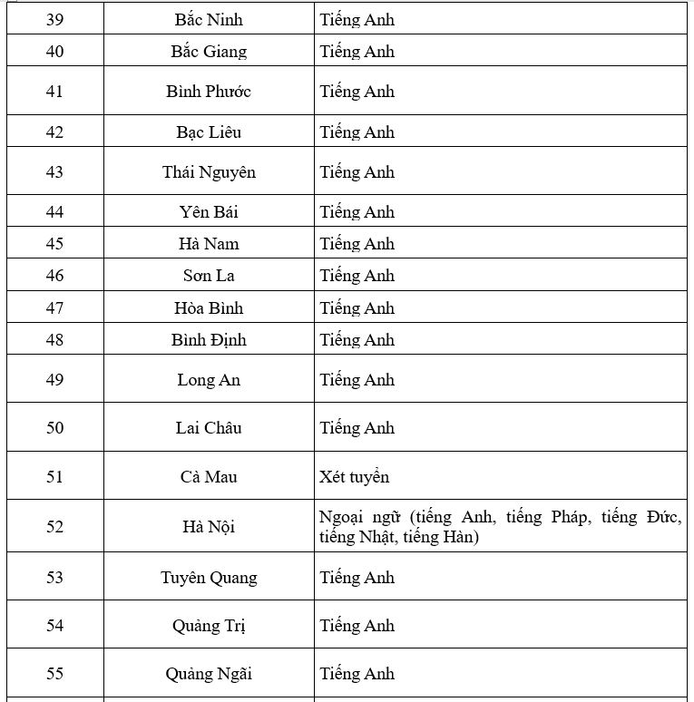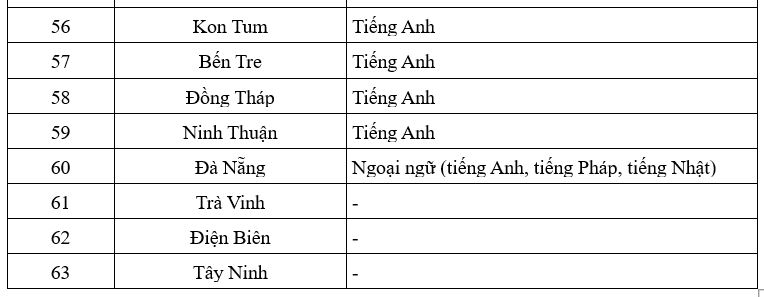 Một số nơi như Hà Nội, Cần Thơ, Hải Phòng... chọn môn Ngoại ngữ, bao gồm: Tiếng Anh và một số thứ tiếng khác như Tiếng Trung, Pháp, Nga, Hàn...