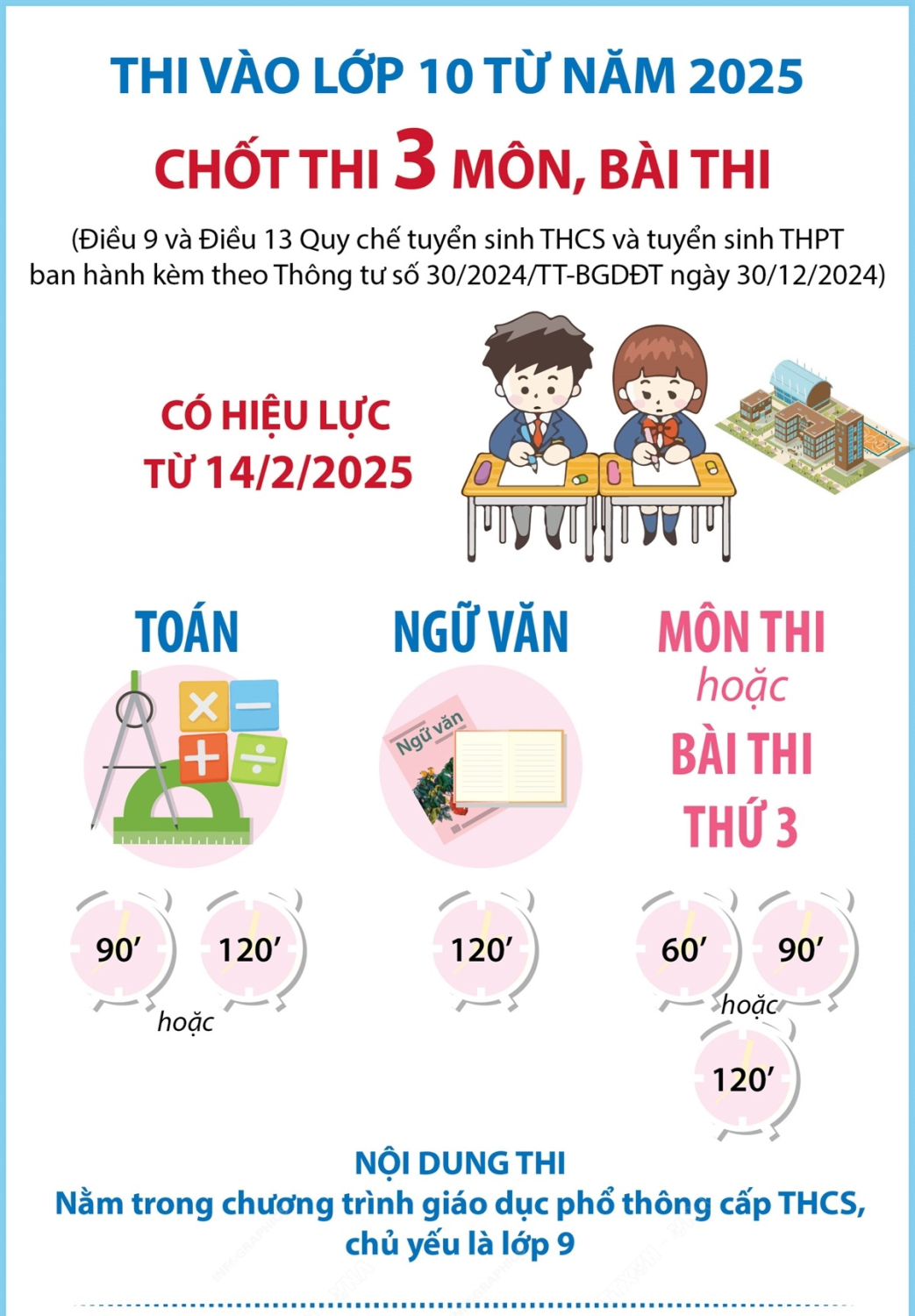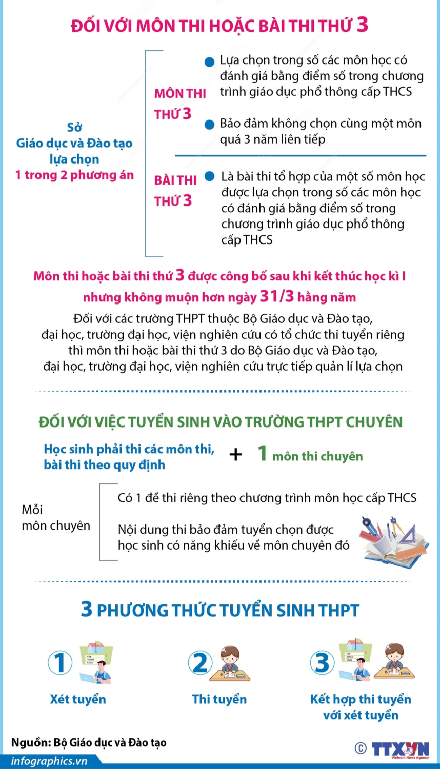 Đối với phương thức thi tuyển, Bộ GD&ĐT quy định thực hiện 3 môn thi, bài thi, gồm: Toán, Ngữ văn và một môn thi hoặc bài thi thứ 3 do Sở GD&ĐT lựa chọn. Môn thi thứ ba được lựa chọn trong số các môn học có đánh giá bằng điểm số trong chương trình giáo dục phổ thông cấp THCS, bảo đảm không chọn cùng quá 3 năm liên tiếp.