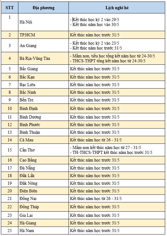 Cụ thể lịch nghỉ hè của các địa phương năm học 2024-2025 như sau: