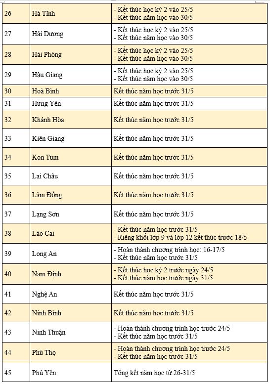 - Cà Mau: Kết thúc học kỳ 2 vào ngày 24/5, tuần dự phòng sau khi kết thúc học kỳ II (hoàn thành chương trình, tổng kết năm học) từ ngày 26-31/5...