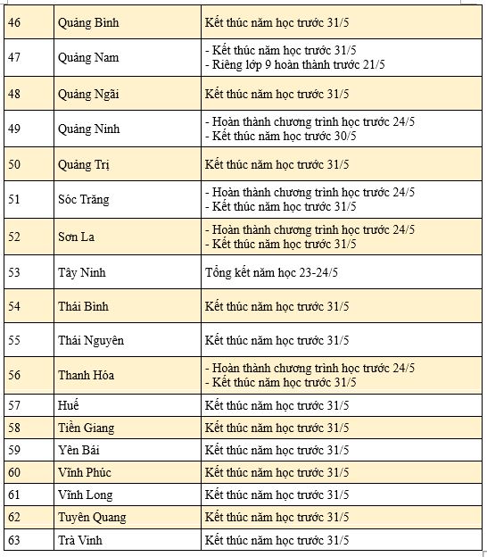 - An Giang: Kết thúc học kỳ 2 vào 23/5 và việc tổng kết năm học diễn ra vào tuần cuối tháng 5 tuỳ từng trường.