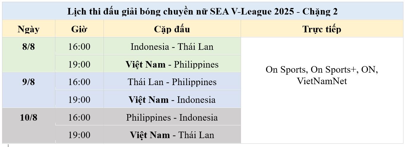 Theo đó, chặng 2 của SEA V-League 2025 sẽ diễn ra từ ngày 8 đến 10/8 tại Nhà thi đấu tỉnh Ninh Bình. Đây được xem là cơ hội quan trọng để tuyển nữ Việt Nam hướng đến mục tiêu đánh bại Thái Lan lần đầu tiên trong lịch sử giải.