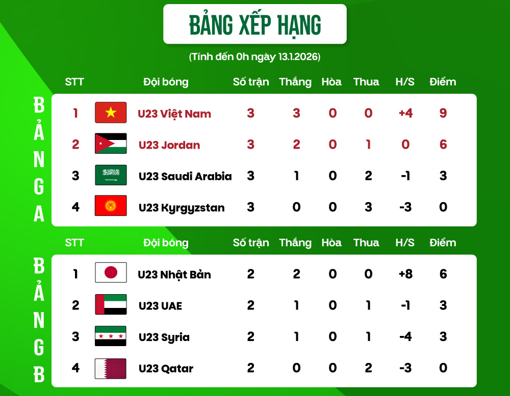 Theo đó, U23 Việt Nam đứng đầu bảng A giải U23 châu Á 2026 với thành tích toàn thắng. Đây là kỳ tích chưa từng có trong lịch sử bóng đá Việt Nam. Sau khi giành quyền vào tứ kết, nhà cầm quân người Hàn Quốc và học trò chờ xác định đối thủ vào rạng sáng mai (14/1) theo giờ Việt Nam.
