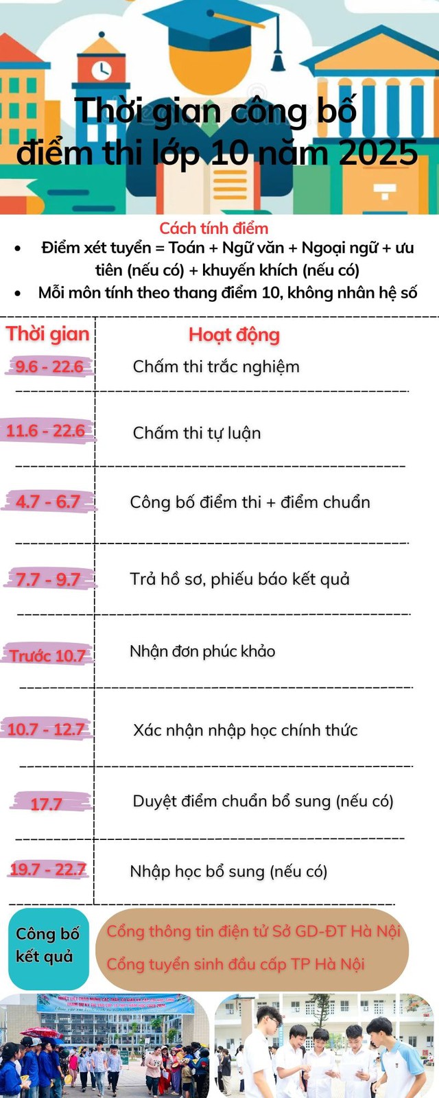 Từ ngày 4 đến ngày 6/7, Sở sẽ công bố điểm bài thi các môn của thí sinh trên Cổng thông tin điện tử của Sở Giáo dục và Đào tạo Hà Nội https://hanoi.edu.vn và Cổng tuyển sinh đầu cấp của thành phố https://tsdaucap.hanoi.gov.vn. Đồng thời, Sở GD&ĐT Hà Nội cũng sẽ công bố điểm chuẩn của các trường trong khoảng từ ngày 4 đến ngày 6/7.
