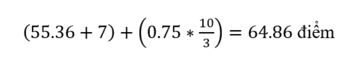 Ví dụ: Thí sinh A đạt điểm thi đánh giá tư duy là 55,36, có chứng chỉ IELTS đạt 8.0 (thưởng 7 điểm), thí sinh thuộc khu vực 1 (+0.75 theo thang 30) thì điểm xét tuyển theo điểm thi đánh giá tư duy sẽ là: