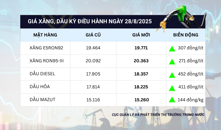 Trước những diễn biến giá thành phẩm xăng dầu thế giới trong thời gian gần đây và thực hiện điều hành giá xăng dầu theo cơ chế thị trường có sự quản lý của Nhà nước, Bộ Công Thương và Bộ Tài chính quyết định trong kỳ điều chỉnh ngày 28/8/2025, không thực hiện trích lập và không chi Quỹ Bình ổn giá xăng dầu đối với tất cả các mặt hàng.
