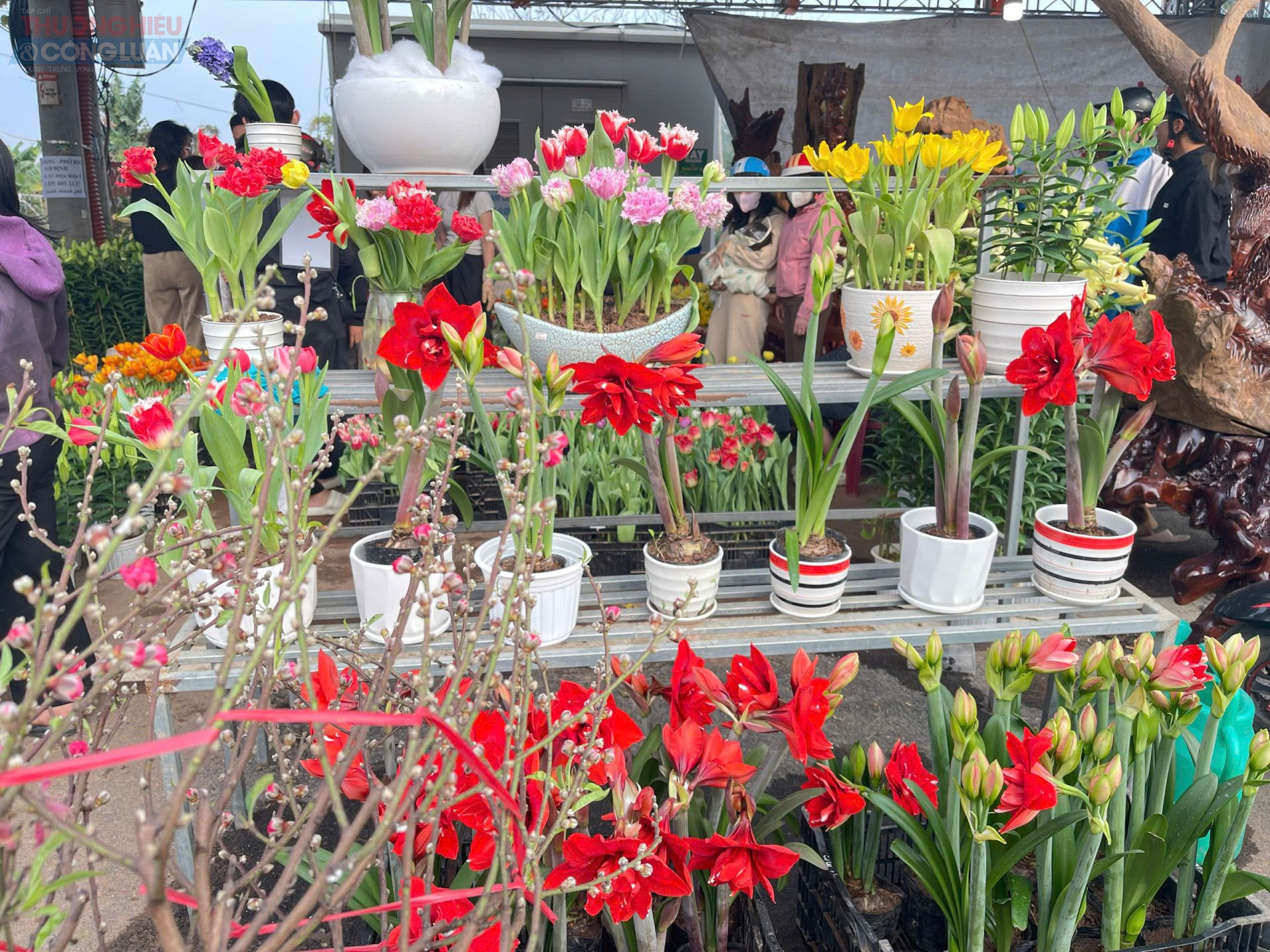 Dọc tuyến chợ, hàng trăm loại hoa và cây cảnh được đưa về phục vụ thị trường Tết, với đủ màu sắc, kích thước và kiểu dáng. Những loại quen thuộc như đào, quất vẫn chiếm số lượng lớn. Bên cạnh đó là các loại hoa, cây cảnh được ưa chuộng như trạng nguyên, kim ngân lượng, hoa đồng tiền, hoa lan, dạ yến thảo…, tạo nên không gian rực rỡ, đậm sắc xuân.