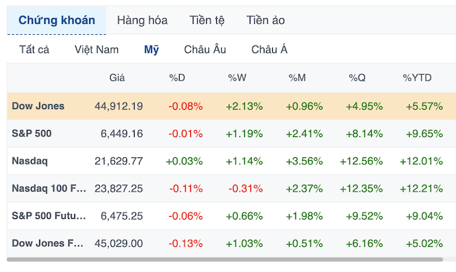 Cụ thể, kết thúc phiên giao dịch ngày 18/8, chỉ số Dow Jones mất 34.30 điểm (tương đương 0.08%) còn 44,911.82 điểm. Chỉ số S&P 500 hạ 0.01% xuống 6,449.15 điểm, trong khi chỉ số Nasdaq Composite nhích 0.03% lên 21,629.77 điểm.