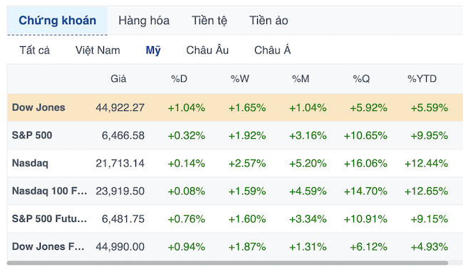 Chứng khoán Mỹ tiếp tục tăng điểm sau phiên lập kỷ lục ngày 12/08, được thúc đẩy bởi báo cáo lạm phát hạ nhiệt hơn so với dự báo đã khiến nhà đầu tư hy vọng về việc Fed hạ lãi suất vào tháng 9/2025. Nhà đầu tư đang dự báo xác suất gần 100% Fed sẽ hạ lãi suất tại cuộc họp tháng 9/2025, theo dữ liệu từ công cụ CME FedWatch.