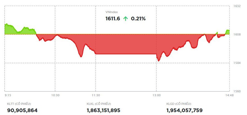 Với sự hỗ trợ của lực cầu cuối phiên, VN-Index từ từ hồi phục, vượt qua mốc tham chiếu và khép lại phiên giao dịch trong sắc xanh nhẹ. Đáng chú ý, chỉ số đã vượt qua ngưỡng kháng cự ngắn hạn 1.610 điểm, mở ra kỳ vọng duy trì đà tăng trong những phiên tiếp theo.