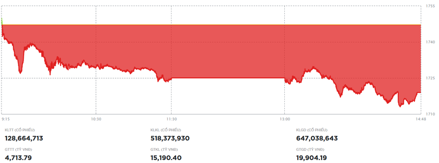 Đóng cửa, sàn HOSE có 121 mã tăng và 188 mã giảm, VN-Index giảm 28,19 điểm (-1,61%), xuống 1.718,98 điểm. Tổng khối lượng giao dịch đạt hơn 647 triệu đơn vị, giá trị 19.904,2 tỷ đồng, giảm 33% về khối lượng và 32% về giá trị so với phiên hôm qua. Giao dịch thỏa thuận đóng góp hơn 130 triệu đơn vị, giá trị 4.743 tỷ đồng.
