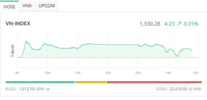 Đóng cửa, sàn HOSE có 191 mã tăng và 263 mã giảm, VN-Index tăng 4,23 điểm (+0,32%), lên 1.330,28 điểm. Tổng khối lượng giao dịch đạt hơn 1,02 tỷ đơn vị, giá trị 22.775,3 tỷ đồng, tăng 6,8% về khối lượng và 9,5% về giá trị so với phiên cuối tuần trước ngày 7/3. Giao dịch thỏa thuận đóng góp 165,6 triệu đơn vị, giá trị 2.877 tỷ đồng.