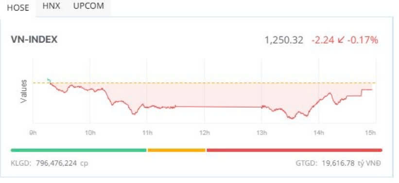 VN-Index đã lấy lại được mốc 1.250 điểm với thanh khoản lên cao nhất trong hơn 1 tháng, đạt gần 20.000 tỷ đồng, tuy nhiên, sự thiếu đồng thuận của nhóm cổ phiếu ngân hàng và chứng khoán đã cản trở đà khởi sắc của thị trường, khiến chỉ số chung khép lại với mức giảm nhẹ.