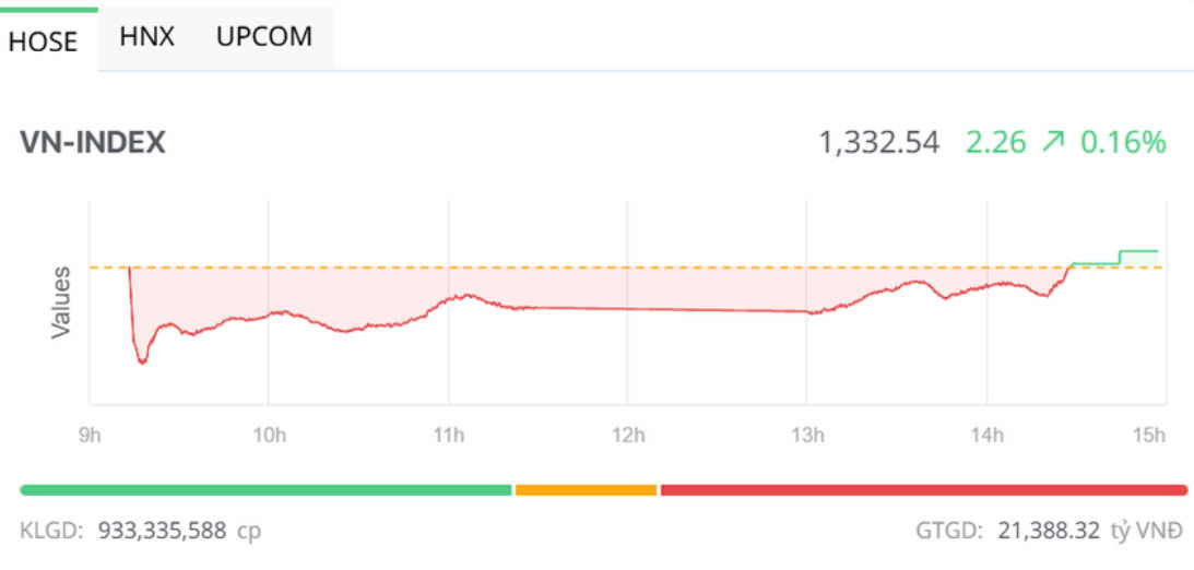 Đóng cửa, sàn HOSE có 231 mã tăng và 247 mã giảm, VN-Index tăng 2,26 điểm (+0,17%), lên 1.332,54 điểm. Tổng khối lượng giao dịch đạt hơn 933,3 triệu đơn vị, giá trị 21.388,3 tỷ đồng, giảm hơn 8% về khối lượng và 6% về giá trị so với phiên hôm qua. Giao dịch thỏa thuận đóng góp hơn 85,8 triệu đơn vị, giá trị 2.399 tỷ đồng.
