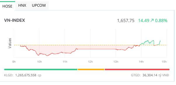 Chốt phiên, sàn HOSE có 163 mã tăng và 152 mã giảm, VN-Index tăng 14,49 điểm (+0,88%), lên 1.657,75 điểm. Tổng khối lượng giao dịch đạt hơn 1,27 tỷ đơn vị, giá trị 36.626 tỷ đồng, tăng 27% về khối lượng và 22,77% về giá trị so với phiên hôm qua. Giao dịch thỏa thuận đóng góp hơn 75,2 triệu đơn vị, giá trị 1.998 tỷ đồng.