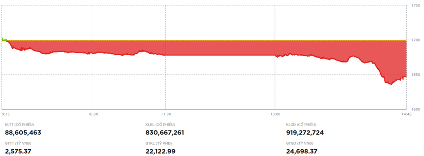 Mặt khác, ngay cả một số bluechip cũng chịu tác động bởi lực cung chung và giảm sâu, với cặp đôi VHM-VRE giảm hết biên độ đã khiến VN-Index lao dốc mạnh, mất hơn 60 điểm về dưới 1.640 điểm trước khi hãm đà rơi ở những phút cuối.
